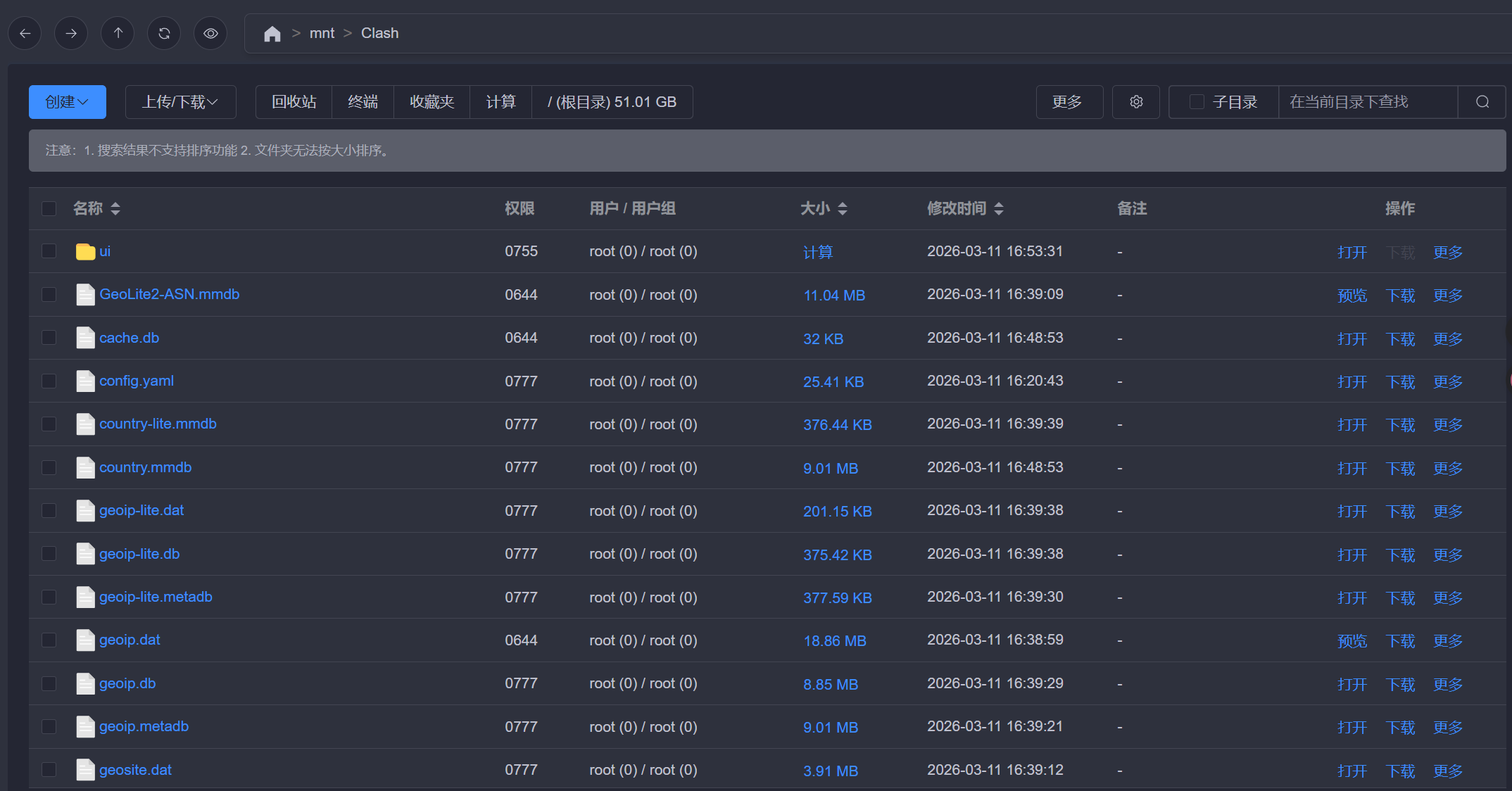 GeoLite2-ASN.mmdb将这4个文件上传到mihomo容器和config.yaml 同级目录中 我的就是上传到/mnt/Clash中。